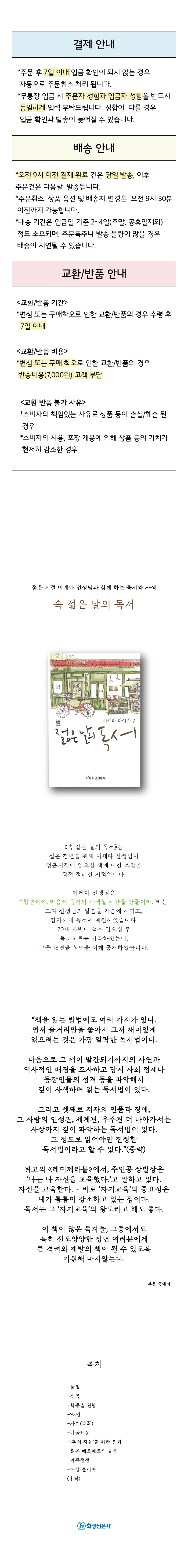 | ¸ñÂ÷ ¶Ç´Â Ã¥¼Ò°³ | ÀÌÄÉ´Ù ¼±»ý´ÔÀº ¡°Ã»³âÀÌ¿©, ¸¶À½¿¡ µ¶¼¿Í »ç»öÇÒ ½Ã°£À» ¸¸µé¾î¶ó.¡±¶ó´Â µµ´Ù ¼±»ý´ÔÀÇ ¸»¾¸À» °¡½¿¿¡ »õ±â°í, ÁøÁöÇÏ°Ô µ¶¼¿¡ ¸ÅÁøÇÏ¿´½À´Ï´Ù. 20´ë Ãʹݿ¡ Ã¥À» ÀÐÀ¸½Å ÈÄ µ¶¼³ëÆ®¸¦ ±â·ÏÇϼ̴µ¥, ±×Áß 18ÆíÀ» °ø°³ÇÏ¿© ´ÜÇົÀ¸·Î ¿«Àº °ÍÀÔ´Ï´Ù. |